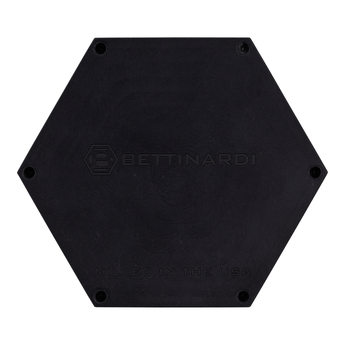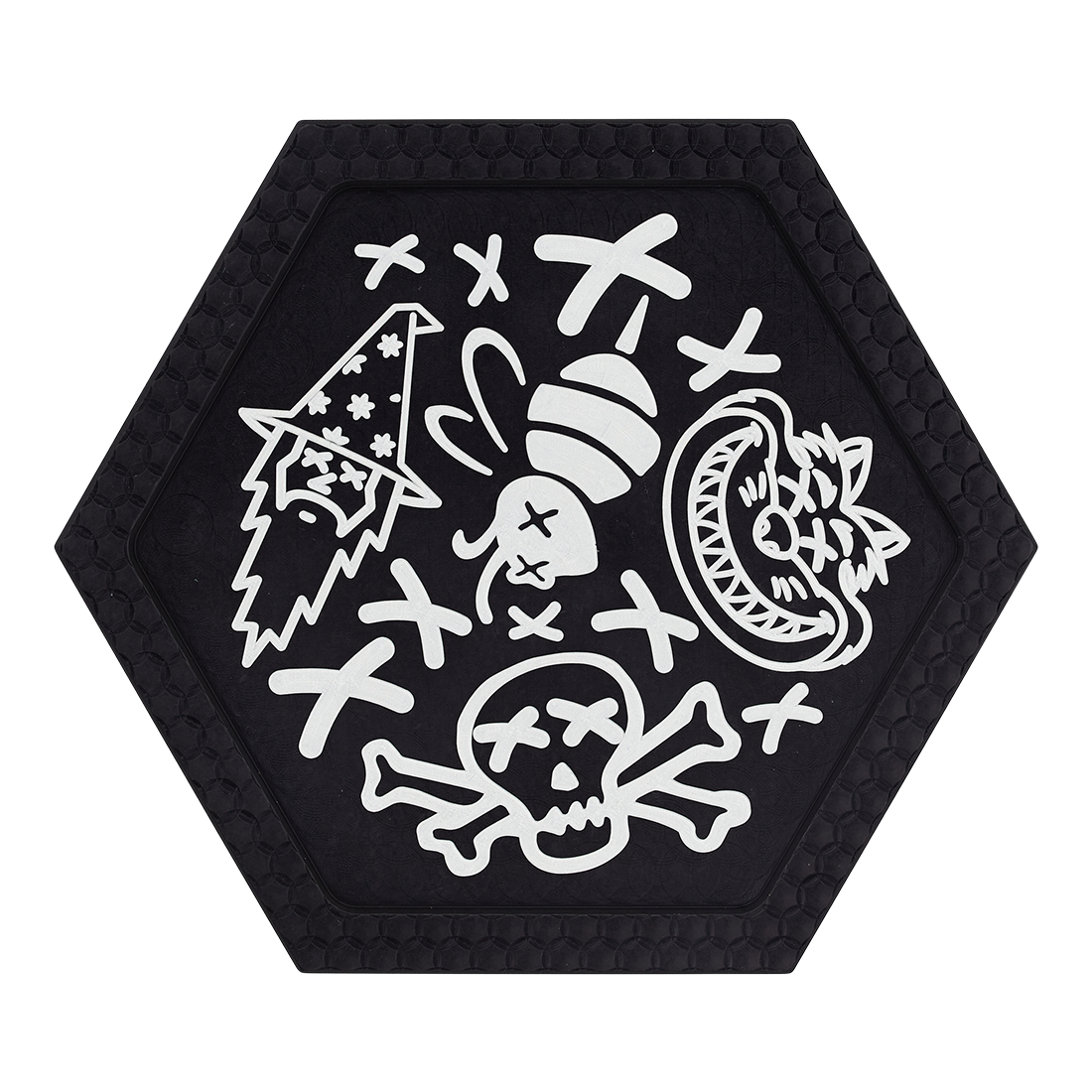 軍用レベルの6061アルミナムのブロックから六角形の板を削り出したのちハニカムパターンを縁取り、内側にポイズンアイコン4種(Fat Cat、Windy City Wizard、Skull、Bee)とポイズンXを彫刻しました。