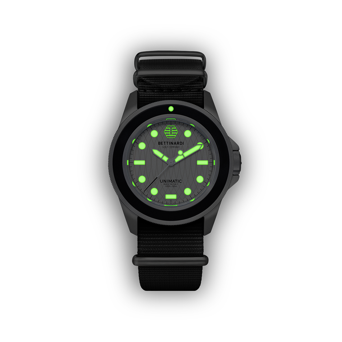 このメイド・イン・イタリーのコラボレーション・ダイバーズウォッチは、文字盤にBETTINARDIのシグネチャーであるフライミルパターンをアシッドエッチング加工で表現、照度の落ちる環境下では、視認性の高いSuper-LumiNova®C3(ペールグリーン)がT-Hiveロゴと針およびアワーマークを照らします。