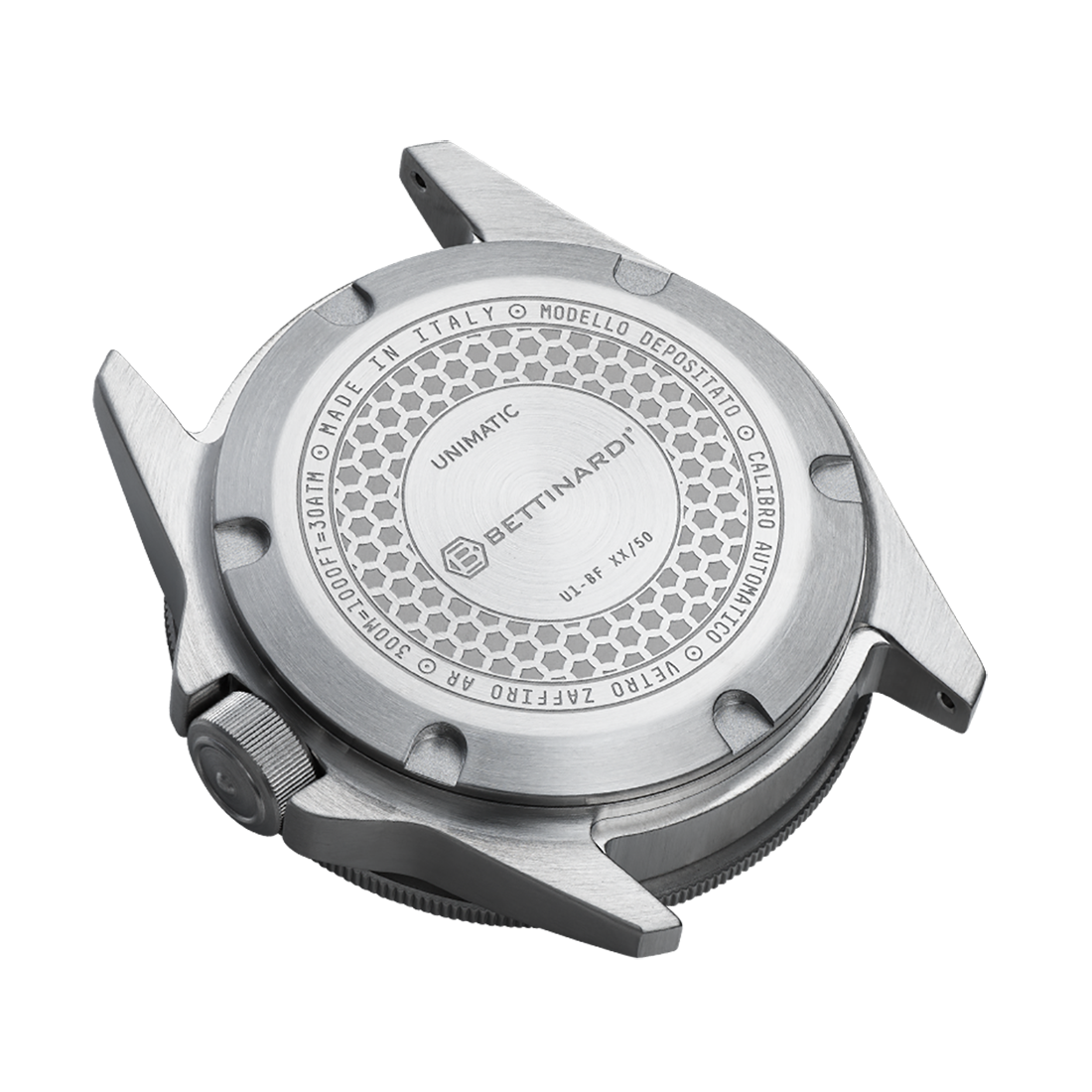 文字盤には「BETTINARDI GOLF COMPANY」と「UMIMATIC」のワードマークをプリント、ケースバックにはハニカムパターンの上にHexBとBETTINARDIのロゴが刻印されています。