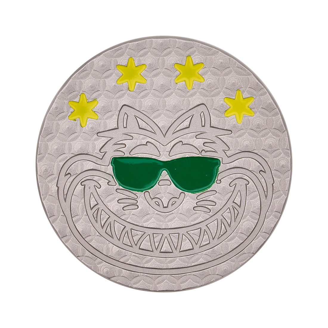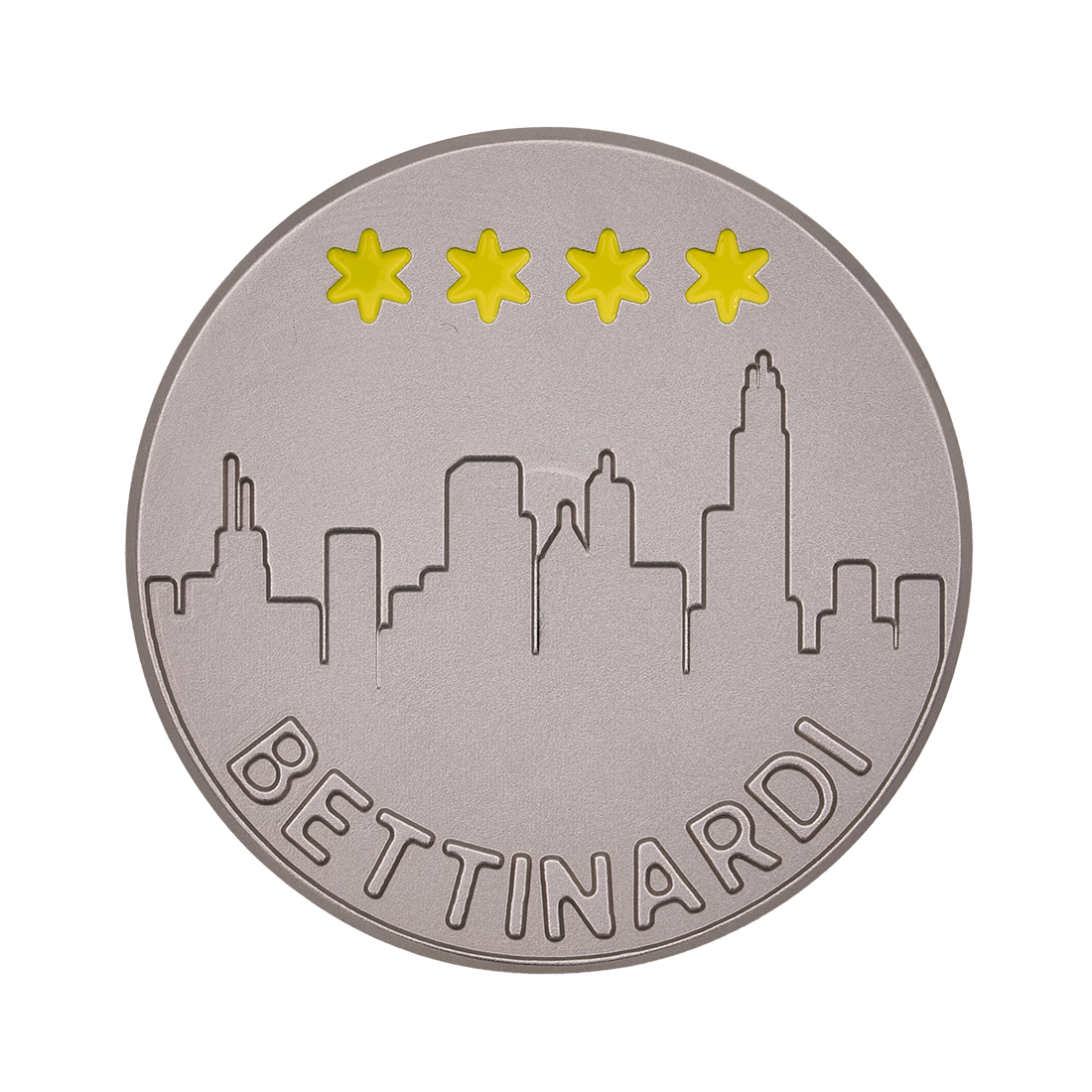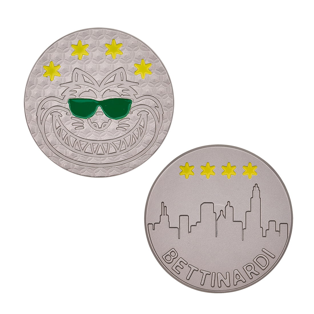 おもて面はハニカムパターンを施した上にサングラスをかけたファット・キャット、うら面はシカゴのスカイラインを彫刻。両面にシカゴ州旗の4つ星を配置しました。