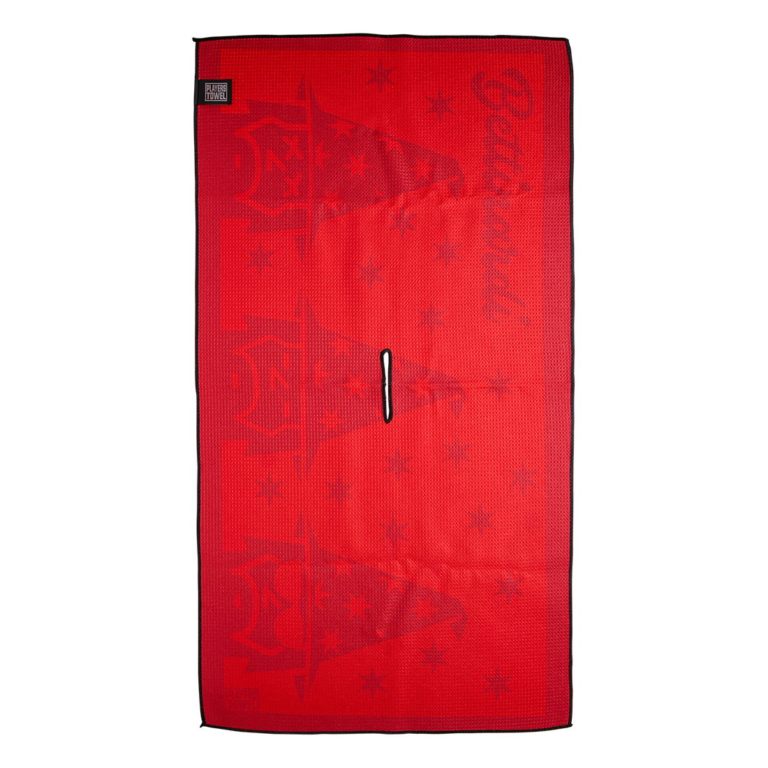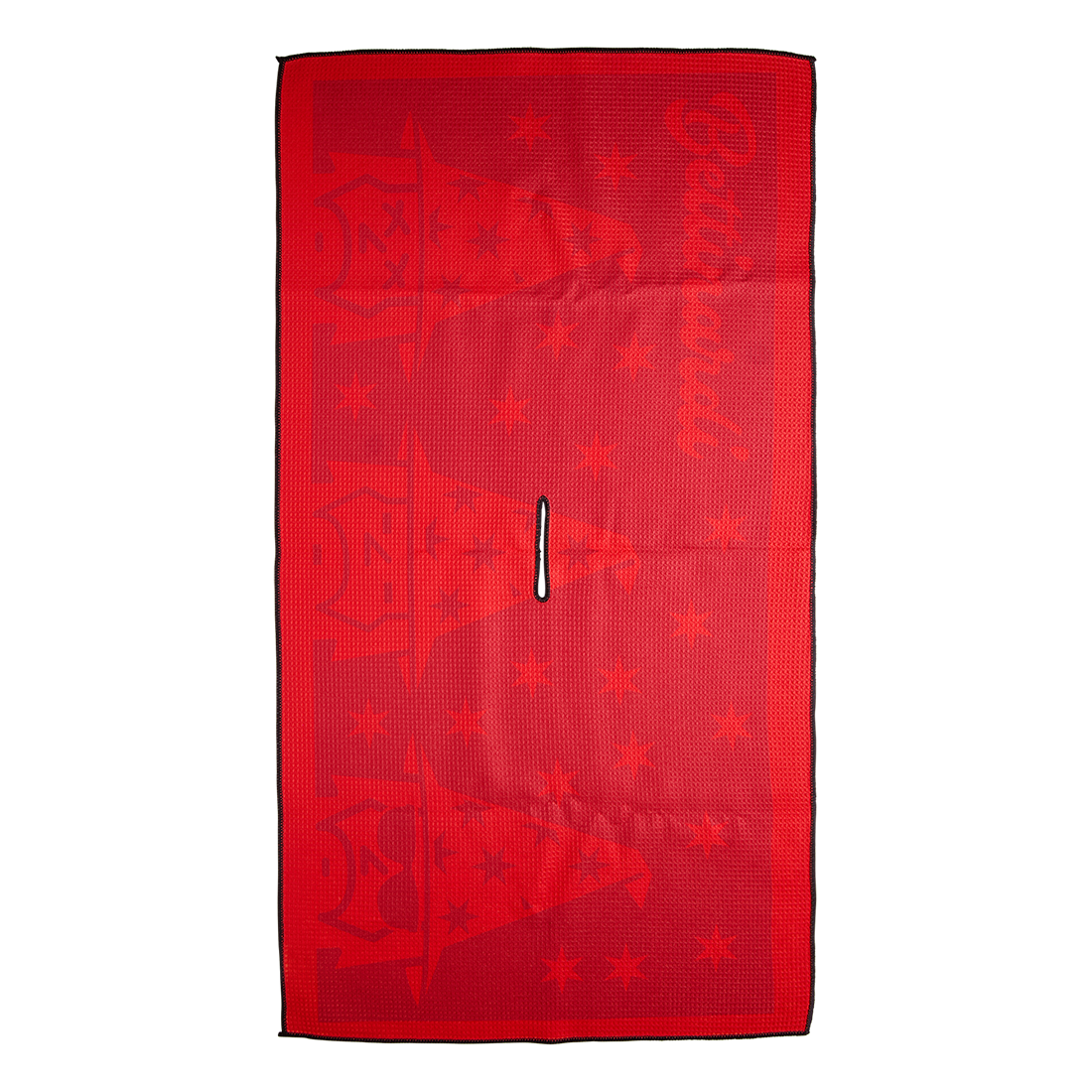 ツートーンレッドのマイクロファイバータオルに3人のウィザード。左右のウィザードはポイズンアイとサングラスをかけたもの。うら面はトーンを反転させたデザインになっています。