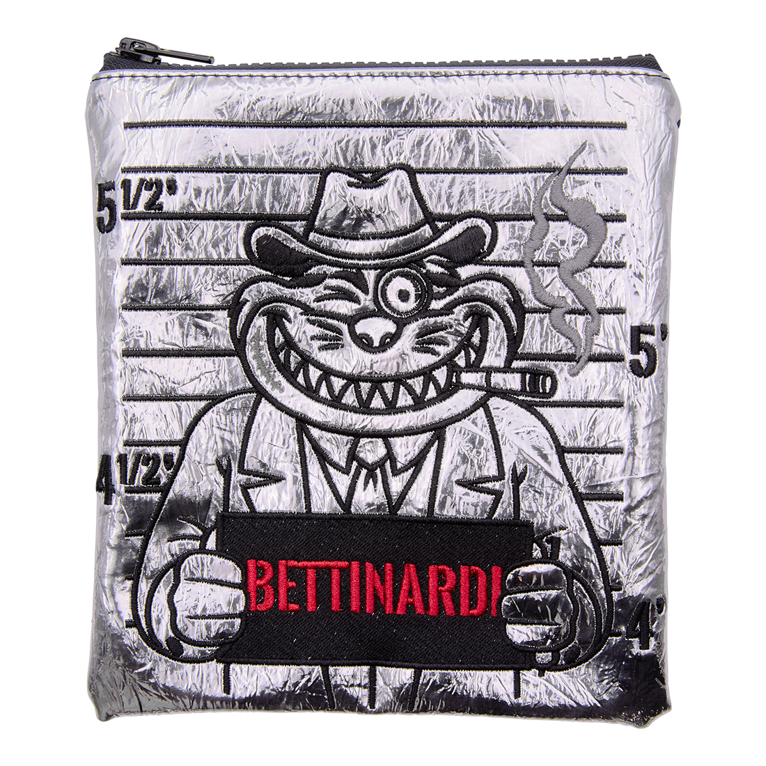 おもて面は銀箔調の生地、指名手配書に載せられたFat Cat Gangsterをモノトーンで刺繍。