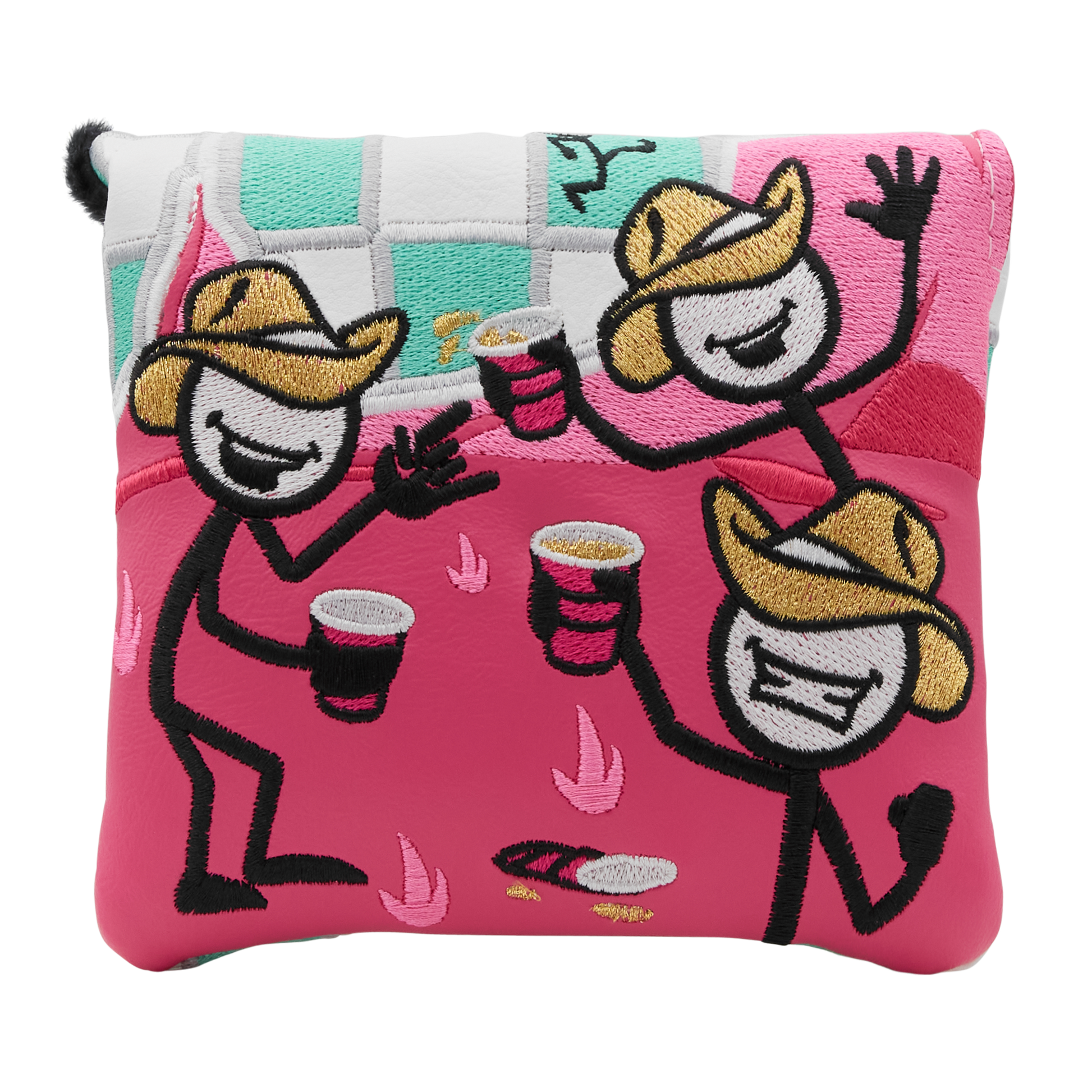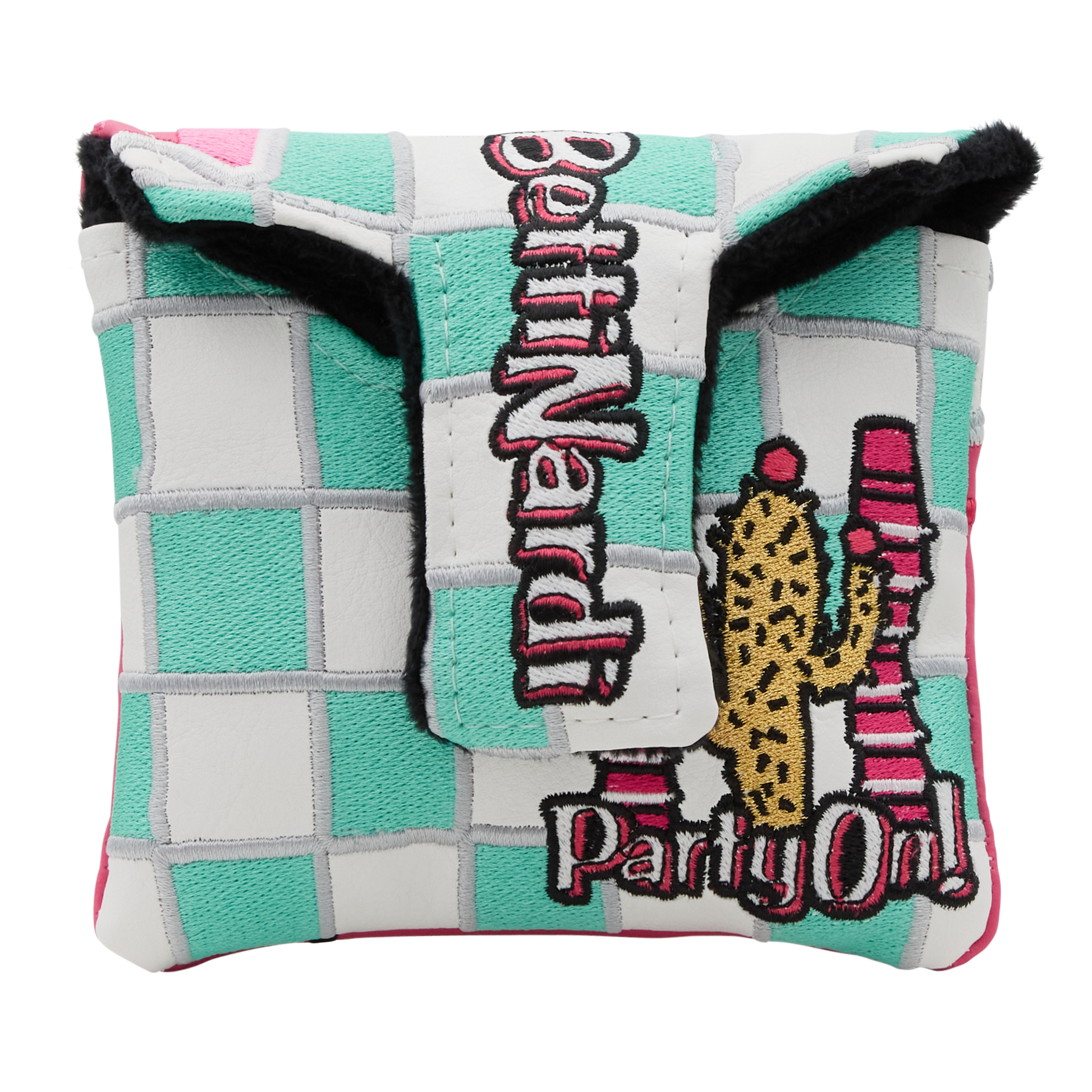 ドリンク片手にゴルフを全力で楽しむ観客たちの空気感を、デザインに落とし込みました。シーグリーンのチェック柄をベースに、ピンクの山岳モチーフを組み合わせた「Party On!」マレットカバーはバッグに収めた瞬間、強烈な存在感を放ちます。