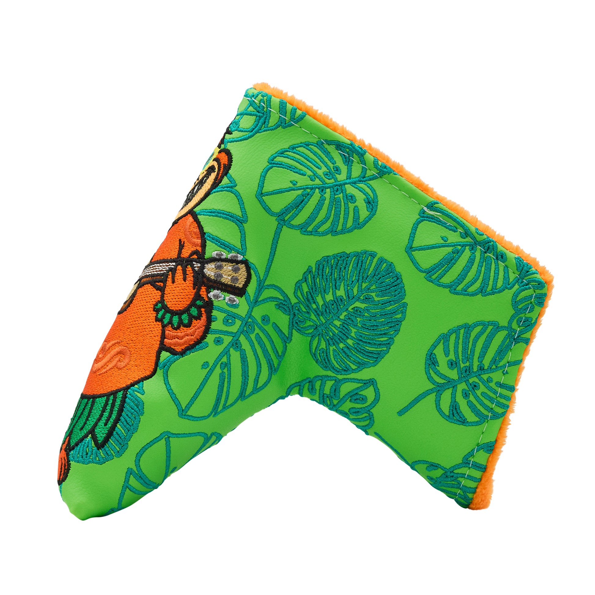 このブレードカバーのフロントには、ティールカラーのトロピカルリーフ柄のベースの上に、サングラスとウクレレ、そして伝統的なフラのスカートを身につけて演奏する “Fat Cat” が刺繍されています。側面にはオレンジで刺繍された Bettinardi のロゴ。日本では5個のみの発売です!