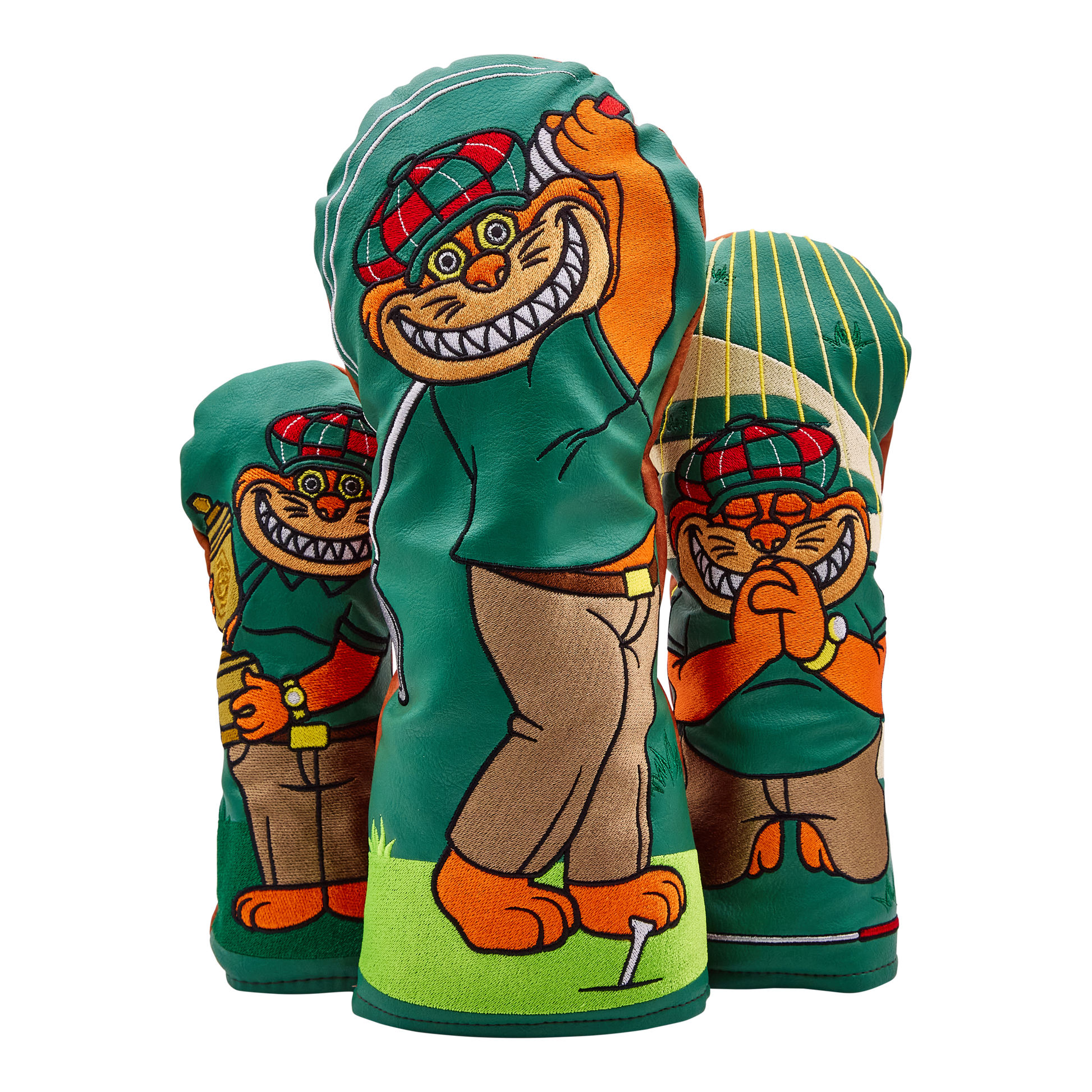 フルショットのドライバーは大きくスライス。祈りを捧げた3 Woodとハイブリッドで勝利を導き、胸を張ってトロフィーを掲げるFat Cat。栄光のWood Setカバーの背面はHorween社のレザーを使用した高級品。限定3セットの販売です。