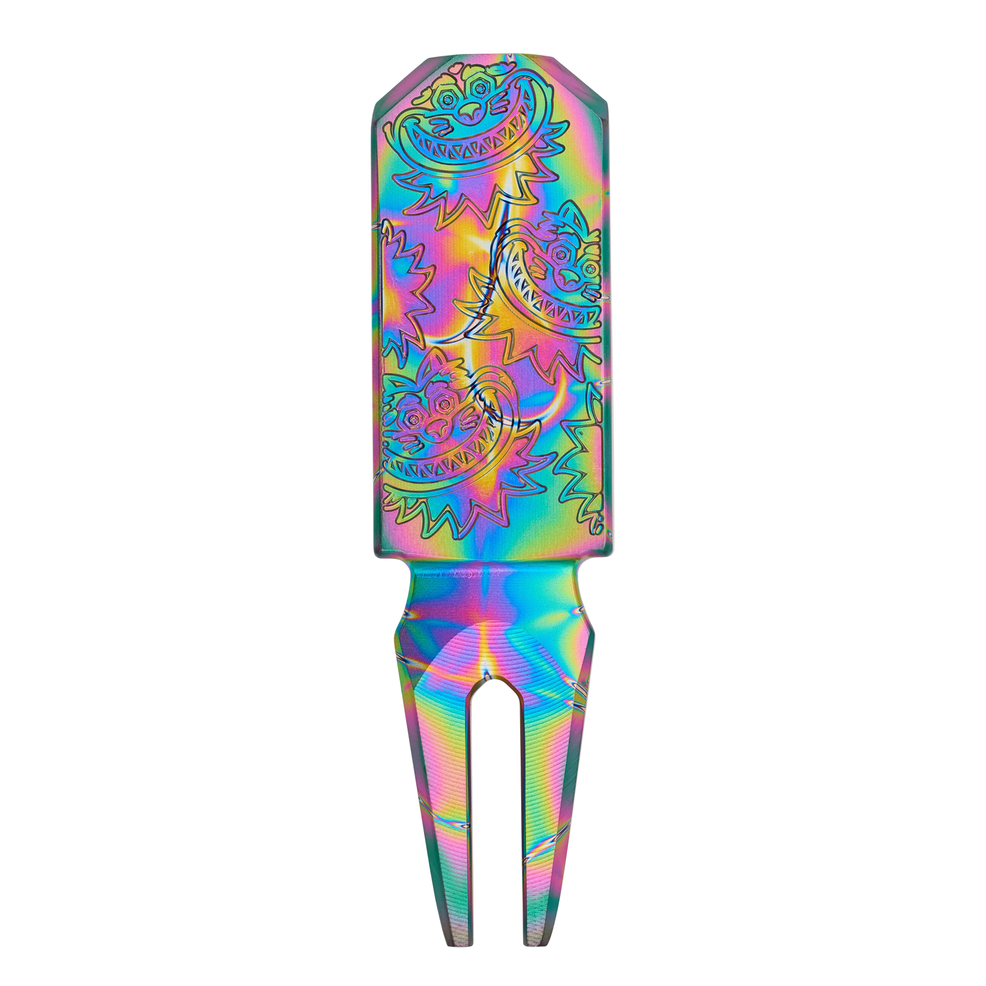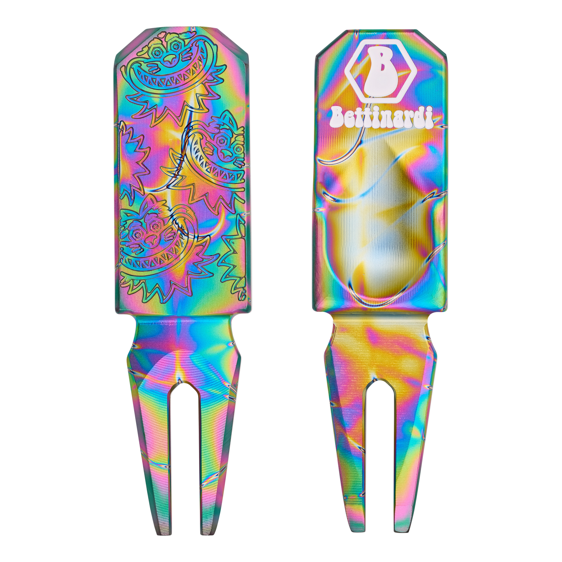 グルービーなディボットツールで、グリーン上では感謝の気持ちを忘れずに!元気いっぱいのGrateful CatとHex Bのロゴを配置し、303SS素材から削り出されたディボットツールです。